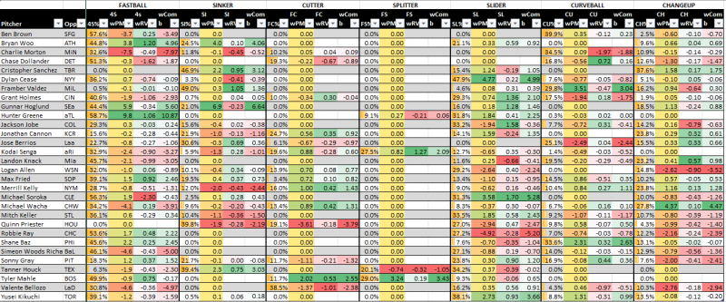 Not a great spot, but nearly any park is an upgrade for Hunter Greene and the most expensive arm is my top arm on Wednesday night and even a strong value. I think he’s that good now. I don’t fear this spot and really, once you go past Sanchez, in a tougher park, it’s really a long drop. You could certainly roster both on DraftKings. The swap off the curveball actually came two starts back for Holmes, but he just threw more fastballs in the first one. The increase in cutters only came against the Dodgers. I think you can take a shot with him at a decent price against a marginal offense here. I’m not really interested at all in bats.