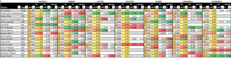 While his strikeout rate has dropped from 32.7% in his first two starts to 21.8% in his next three and then 16.7% over his last two, Kris Bubic had his first single digit SwStr% in his last start (6.9% against a Baltimore lineup he previously had a 15.2% game against). Bubic is still sitting on a 16 K-BB% without an estimator reaching four and sits firmly above the pitch matchup rater in terms of run value simply because he’s facing the White Sox. He drops nearly to the middle of the pack if you add in moderate pitch modeling, where PitchingBot appears to like his stuff more than Pitching+.