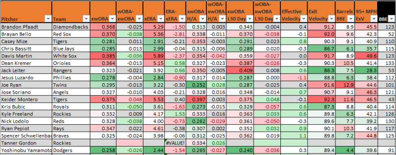 With four quality starts on the season, Brandon Pfaadt still has his blowup games, mostly against offenses with good LHBs, like the Phillies last time out (seven runs, 66.7 HardHit%). His velocity in that game was actually a season high 94.3 mph, a full mph above his season average. With a 16.6 K-BB%, you might not realize that Pfaadt’s strikeout rate is down to 20.7%, which makes the 45.5 HardHit% more of a problem. He did add more curves and changes to combat LHBs. They’re graded above 55 by PitchingBot, but right around 90 by Pitching+. The results have been that batters from both sides of the plate are within six points of a .340 wOBA against him this year though. However, LHBs also had a .348 wOBA against him last year and have six of his seven home runs surrendered this season. Pfaadt’s poor pitch matchup ratings are because, despite all of his pitches being above average via PitchingBot, they have marginal run values at best (except the sinker) and the Dodgers basically demolish everything.