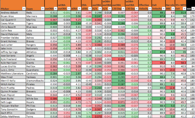 Andrew Abbott has allowed more than one run in just one start with a 92 LOB% and 10.5 SwStr% that matches his walk rate (10.3%) and barely supports his strikeout rate (27.3%). He has awful pitch modeling, but great run values on those pitches. It’s an enigma.