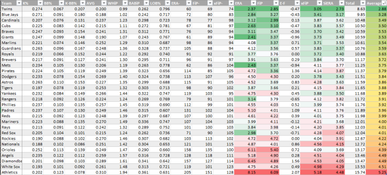 Bullpen SIERA/xFIP/FIP average over the last 30 days (because there’s so much bullpen turnover)