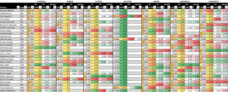 This is not an easy slate, which is why I won’t write off Schmidt despite the return of his issues against LHBs. At more than $8K though, I do have a few guys ahead of him overall and in terms of value. I don’t even hate Ortiz in an SP2 spot with some strikeout upside, but I’m also not ruling out bats here either and am certainly hedging Oritz with some Yankee bats. Kwan, Grisham, Judge, Goldy and Rice match up best from a run value standpoint against the opposing pitcher’s arsenals. Beware that pitchers always have the option of throwing a different pitch, the more likely, the larger their bank of options.