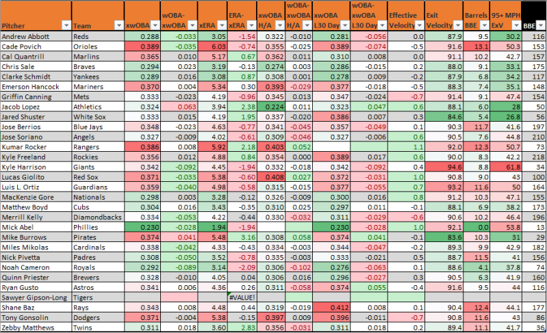 I don’t appear to be the only one who doesn’t understand how Andrew Abbott gets the results he does from a poorly graded arsenal (4.65 Bot ERA, 91 Pitching+), league average 10.7 SwStr% and 9.5% Barrels/BBE. Estimators run as low as a 4.05 xERA to as high as that Bot ERA with a 4.33 dERA also above four.