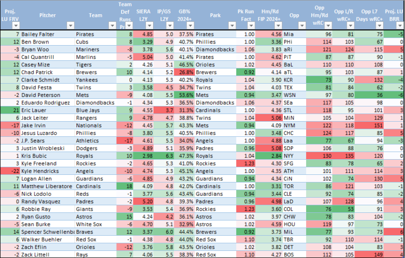 Ryan Gusto last completed five innings on April 23rd. He’s moved a bit further away from the fastball since returning to the rotation (37.1% vs 51.7% previously) and some of them (sinker, cutter, slider) do grade well, but he still has a marginal pitch matchup rating against one of the worst offenses in the league. LHBs exceed a .400 wOBA and xwOBA against him.