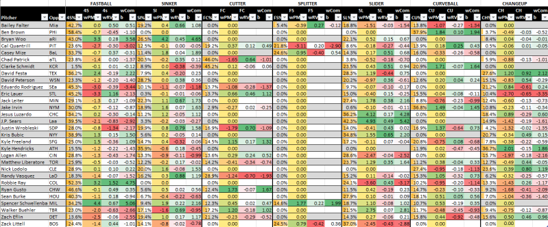 Below, these last two graphics are my new pitch matchup ratings, explained here. It uses pitch frequencies and run values both for the pitcher and the opposing offense and then attempts to add in pitch modeling, which sometimes differs from actual results.