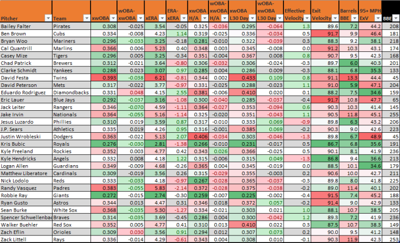 With a 1.1 K-BB%, Randy Vasquez is still running a 3.69 ERA more than a run and a half below almost all of his estimators, the lone exception a 4.11 Bot ERA. LHBs remain above a .400 wOBA and xwOBA against him since last year.