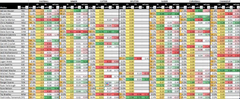 Below, these last two graphics are my new pitch matchup ratings, explained here. It uses pitch frequencies and run values both for the pitcher and the opposing offense and then attempts to add in pitch modeling, which sometimes differs from actual results.