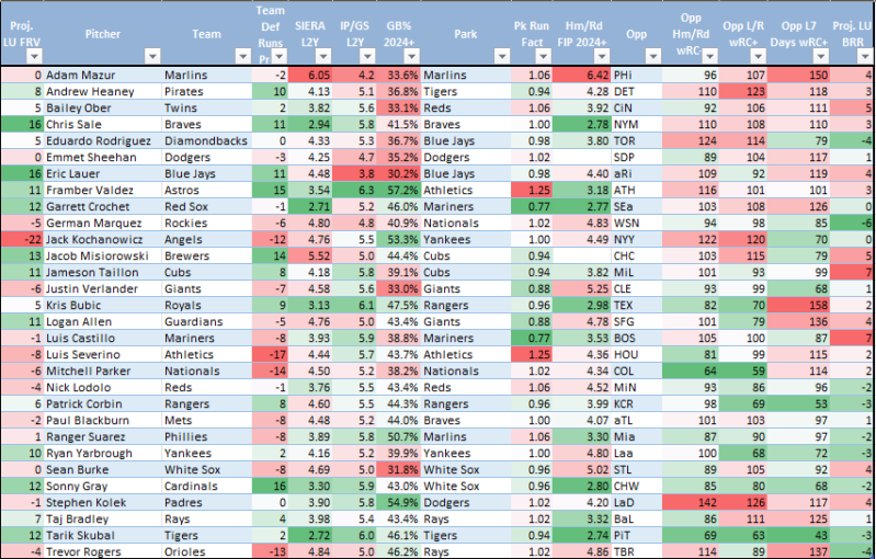 Probably needless to say after last night’s tease, Framber Valdez is my top pitcher on the board. Yes, even in this park, even with temperatures around 90 with a breeze out to left-center. He pitches deep into games with an elevated strikeout rate and keeps the ball on the ground, which gives the opposition few opportunities to do major damage unless he gets BABIP’d, which hasn’t happened with this defense. It gets a bit closer than last night with the weather update, but even with Sonny Gray closing the gap, his weather issues are even worse in that he may not pitch. Bubic would be my top pivot, but perhaps players will shy away from Valdez in this park. That said, Rooker (176 wRC+, .311 ISO v LHP since last year) and Wilson (161, .167) both still rate strongly here and each exceeds a 165 wRC+ over the last month. And you can certainly pile up RHBs against Severino in this park.