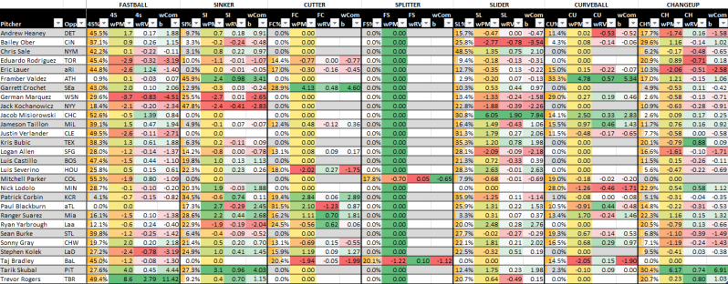 Below, these last two graphics are my new pitch matchup ratings, explained here. It uses pitch frequencies and run values both for the pitcher and the opposing offense and then attempts to add in pitch modeling, which sometimes differs from actual results.