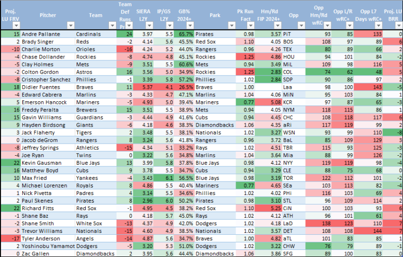 Didier Fuentes is a live arm, who has been rushed to the big leagues. The Braves tend to do this. Sometimes it works (Spencer Schwellenbach), but often it doesn’t. He’s allowed 10 runs in 8.1 innings, striking out four of 40 batters, though surprisingly only walking one. With only a quarter of his contact on the ground, he’s allowed four barrels with a 52.9 HardHit%. The pitch modeling has been strong, however. Projections remain around four and a half.
