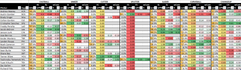 Below, these last two graphics are my new pitch matchup ratings, explained here. It uses pitch frequencies and run values both for the pitcher and the opposing offense and then attempts to add in pitch modeling, which sometimes differs from actual results.