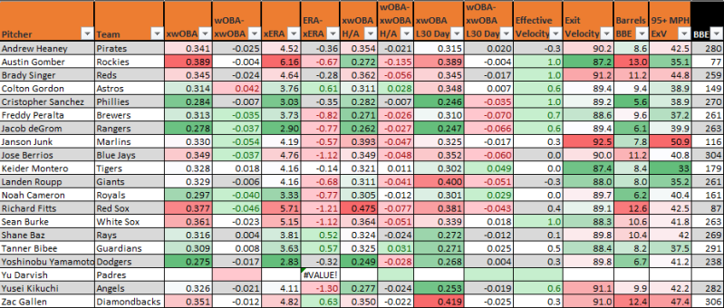 Would you believe a pitcher could go half a season with the wrong grip on his pitches without the team noticing it? You’d likely ask if he pitched for the Rockies or Angels, but since the Angels have discovered that problem, Yusei Kikuchi has struck out 38 of 101 batters (16.3 SwStr%) with increased curveball usage (22%) and velocity (0.5 mph). He’s walked just five, which has helped him thrive while still allowing 10.3% Barrels/BBE with a 48.3 HardHit5 over this span. Kikuchi has a 2.38 SIERA and .253 xwOBA allowed over the last month.