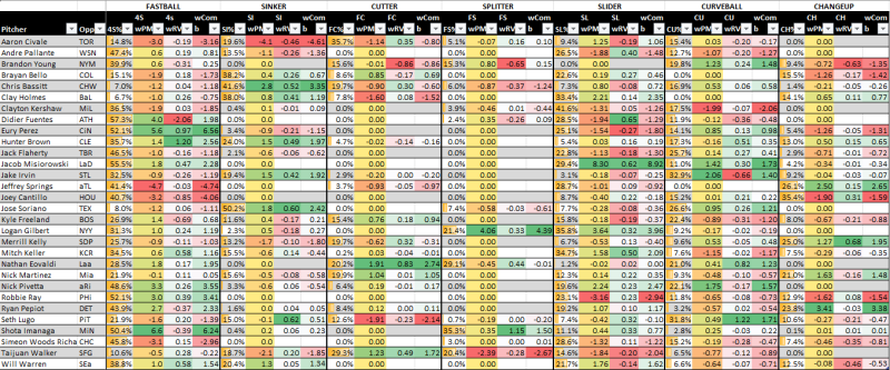 Below, these last two graphics are my new pitch matchup ratings, explained here. It uses pitch frequencies and run values both for the pitcher and the opposing offense and then attempts to add in pitch modeling, which sometimes differs from actual results.