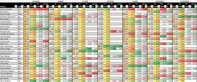 Below, these last two graphics are pitch matchup ratings, explained here. It uses pitch frequencies and run values both for the pitcher and the opposing offense and then attempts to add in pitch modeling, which sometimes differs from actual results.