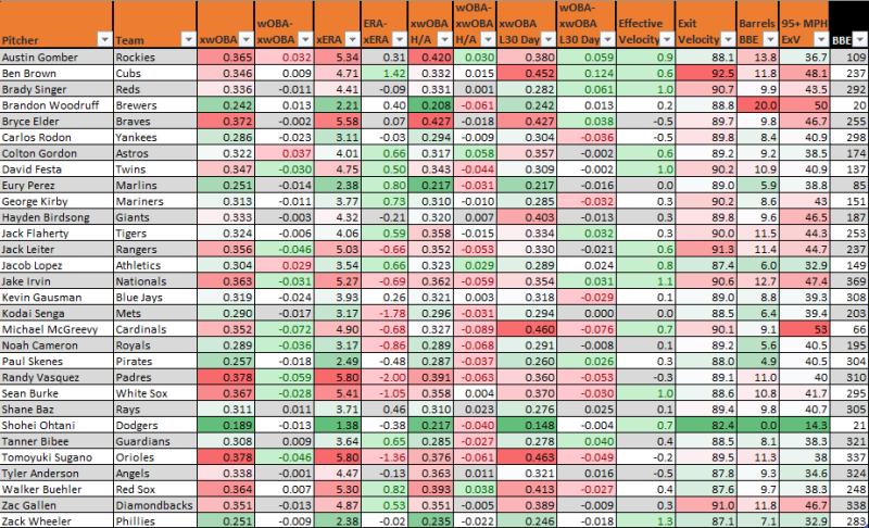 Over his last 48.2 innings, Jacob Lopez has posted an elite 22.2 K-BB% with a 34.9 HardHit% and just 7.1% Barrels/BBE. The breakout has been a bit hidden by the 25 runs (23 earned) over this period with all nine of his barrels leaving the park, six of them at home and another in Toronto against the top lineup against LHP in the league. While RHBs have a .341 wOBA against Lopez this year, Statcast drops that 30 points with LHBs below .300. There’s a bit of a disconnect with he pitch modeling, though both systems love the slider (31.3%, 58 PB, 114 P+).