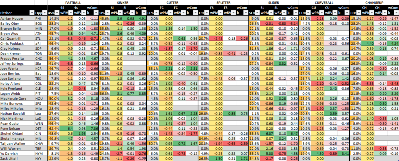 Below, these last two graphics are pitch matchup ratings, explained here. It uses pitch frequencies and run values both for the pitcher and the opposing offense and then attempts to add in pitch modeling, which sometimes differs from actual results.