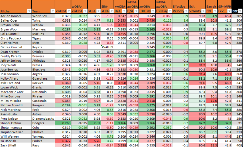 Walking a season high four Braves his last time out, Nathan Eovaldi ran up an 86 pitch count in just five innings because he also struck out seven of 21 batters. Without allowing a run, I’m a bit surprised the Rangers didn’t give him one more, as he threw 102 pitches in his previous start. At 35 years old, Eovaldi’s velocity is down to 94 mph, but with a career high 22.5 K-BB% (22.6% during the pandemic season) with his best hard hit rate (38.4%) in four years. The 1.50 ERA is a fluke (.254 BABIP, 85.4 LOB%, five home runs on 19 barrels), but a 3.29 xERA and some confusing pitch modeling (3.99 Bot ERA, 102 Pitching+) are his only estimators above three.