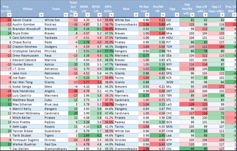 Brown Schlittler may have surpassed Pfaadt Abbott as my favorite pitching matchup of the year and I think both pitchers are usable here. Schlittler in the same way as Ginn, but a wider range of outcomes and a bit more upside. I’m not saying the Yankees are all fixed with Judge back and six in the projected lineup exceed a 24 K% against RHP this year, but this is not the slate for an expensive Brown in a dangerous spot. I have at least 10 pitchers on this elite pitching board ahead of him overall.