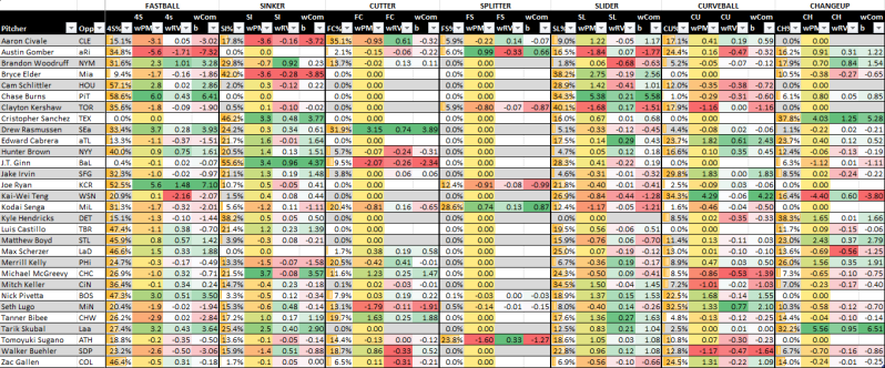 Below, these last two graphics are pitch matchup ratings, explained here. It uses pitch frequencies and run values both for the pitcher and the opposing offense and then attempts to add in pitch modeling, which sometimes differs from actual results.