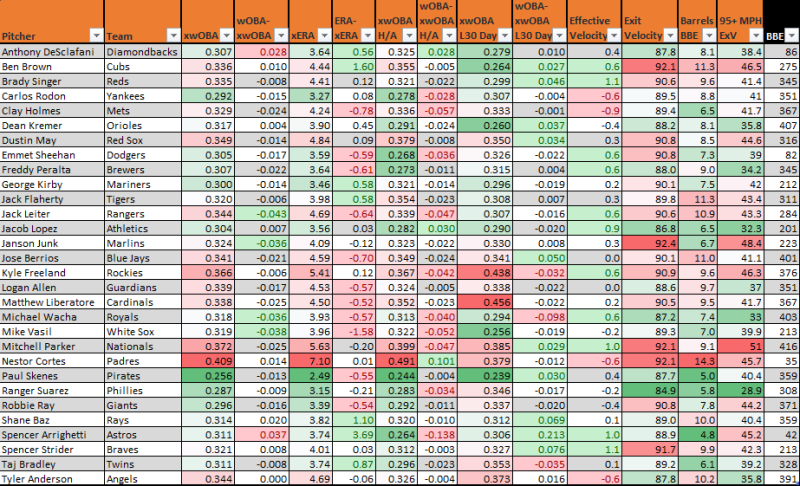 SpAghetti has allowed five runs in each of his last two starts (at MIA & MIN) and has just an 11.3 K-BB% and 45.2 HardHit% through three starts. However, with just two barrels, that’s a 3.74 xERA. Pitch modeling seems to be fine with what he’s throwing and the 14.3 SwStr% is more important than the 21 K% through just three starts. He showed some upside with a 27.1 K% last season.