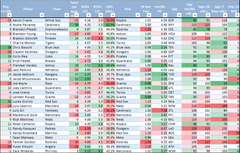 If we knew Cantillo were healthy here, I really wouldn’t mind him in a pitcher friendly park against a lineup with some strikeouts in it that has struggled against LHP. In fact, if I factor in his overall numbers, he’d be a part of that top eight cluster with deGrom and Bassitt plus others, but that velocity roller coaster scares the crap out of me.
