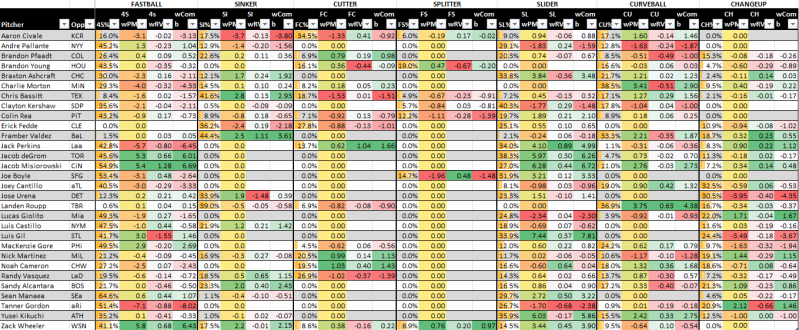Below, these last two graphics are pitch matchup ratings, explained here. It uses pitch frequencies and run values both for the pitcher and the opposing offense and then attempts to add in pitch modeling, which sometimes differs from actual results.