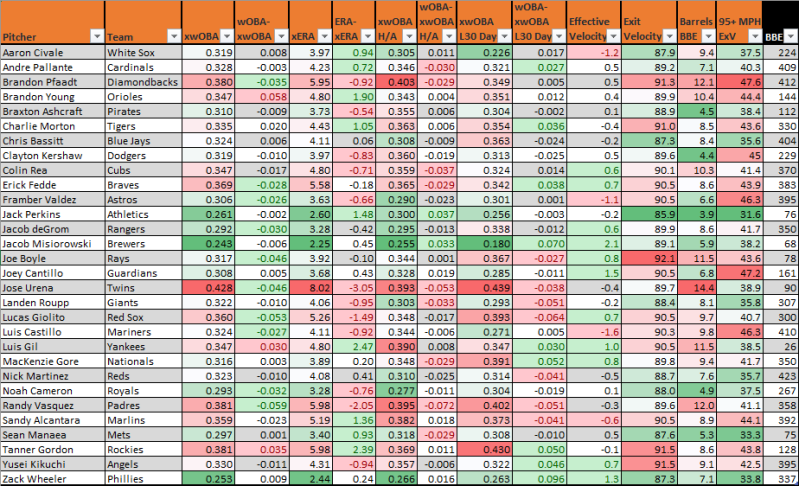 Lucas Giolito has abysmal pitch modeling, while his estimators only range as low as a 4.41 xFIP. He has been productive at times, but is coming off of walking six Padres and now carries an 11.8 K-BB%, while allowing 9.6% Barrels/BBE on the year.