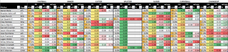 Below, these last two graphics are pitch matchup ratings, explained here. It uses pitch frequencies and run values both for the pitcher and the opposing offense and then attempts to add in pitch modeling, which sometimes differs from actual results.