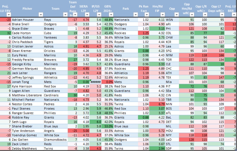 Ray is the top valued high end starter. Horton and Matthew could be great values if they can reach six innings. Same for Leiter in a tough park. Kremer is interesting in San Francisco at a reasonable price.