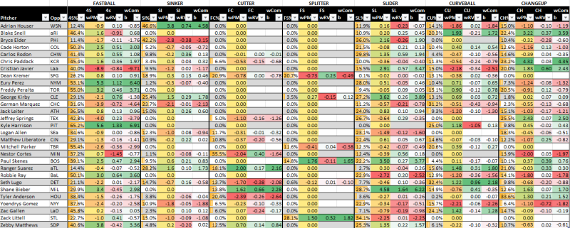 Below, these last two graphics are pitch matchup ratings, explained here. It uses pitch frequencies and run values both for the pitcher and the opposing offense and then attempts to add in pitch modeling, which sometimes differs from actual results.