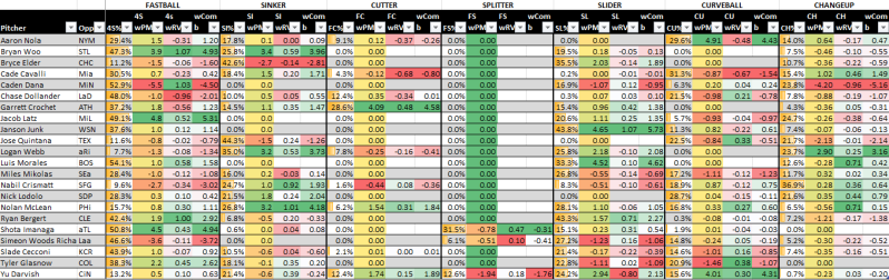 Below, these last two graphics are pitch matchup ratings, explained here. It uses pitch frequencies and run values both for the pitcher and the opposing offense and then attempts to add in pitch modeling, which sometimes differs from actual results.
