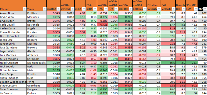 So Luis Morales is running up the strikeout ladder with four, five, six, seven, eight in consecutive starts. His overall 9.3 SwStr% doesn’t really support the 27 K% (though that’s been rising too). The real problem is that he’s allowed seven barrels with a 50 HardHit% over his last three. Non-FIP estimators range from a 3.62 Bot ERA to a 4.49 dERA.