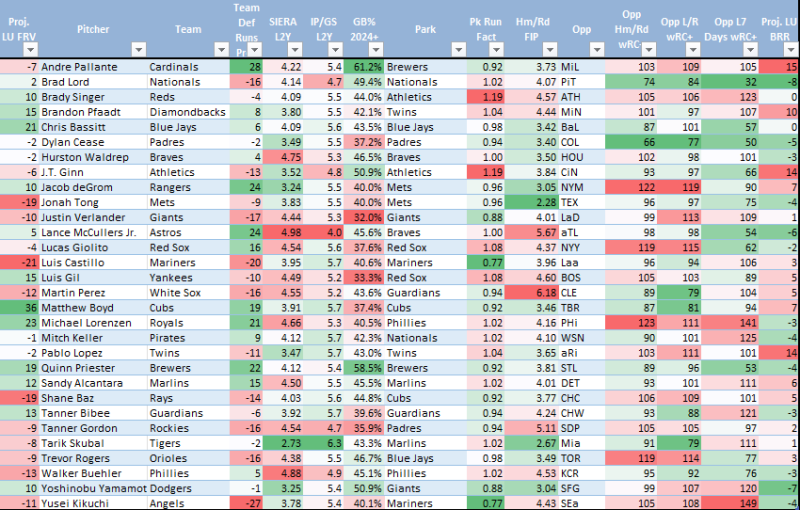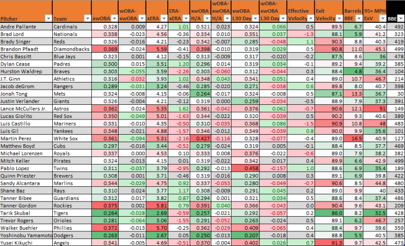 Trevor Rogers broke a string of seven straight starts with one run or less, only one with less than seven innings, by giving up two to the Dodgers over 5.2 innings, while striking out six with a single walk. The bum! He may be getting away with a little something with a 46.7 HardHit%, but most of that hard contact must be on the ground because he still projects just a 3.06 xERA. He has an 18.4 K-BB%, but is up to 21.5% over his last eight starts. Even against the mighty Blue Jays, he’s near the top of the pitch matchup ratings with or without pitch modeling included.