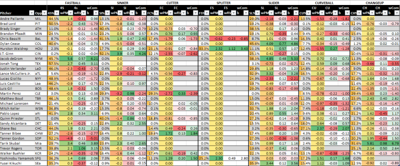 Below, these last two graphics are pitch matchup ratings, explained here. It uses pitch frequencies and run values both for the pitcher and the opposing offense and then attempts to add in pitch modeling, which sometimes differs from actual results.