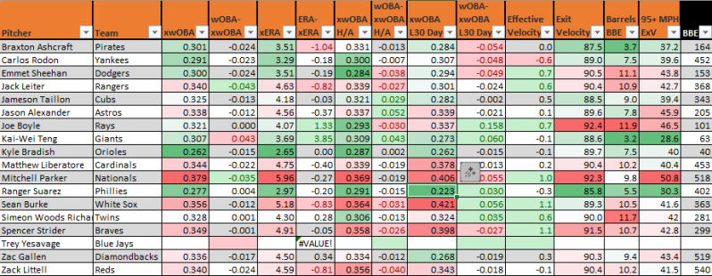 Yes, it was the Rockies, but Emmett Sheehan just completed his second seven inning effort with three hits or less and at least nine strikeouts in his last three starts last time out. He’s up to a 24.8 K-BB% over his last six starts, has a 17.1 SwStr% over his last seven outings (one behind an opener) and we’ll certainly take that, even the 14.1% Barrels/BBE that comes with it because barely more than 60% of batters were putting the ball in play (or homering).