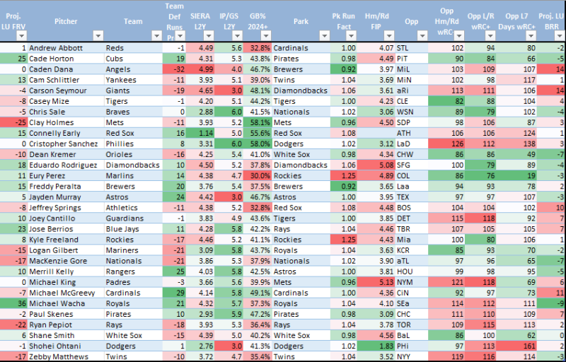 I have Schlittler ranked very closely with Gilbert and a few other guys, but feel I may be shorting him by only weighing his recent month twice his entire season. He’s also cheaper than Gilbert, which makes him more viable here. I have Matthews, who is even a little bit cheaper, a little bit behind. The drop in K-BB concerns me just enough to place him as a middle of the board value despite there likely being plenty of strikeouts in the Yankee lineup.