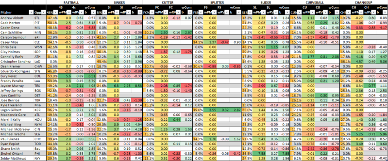 Below, these last two graphics are pitch matchup ratings, explained here. It uses pitch frequencies and run values both for the pitcher and the opposing offense and then attempts to add in pitch modeling, which sometimes differs from actual results.