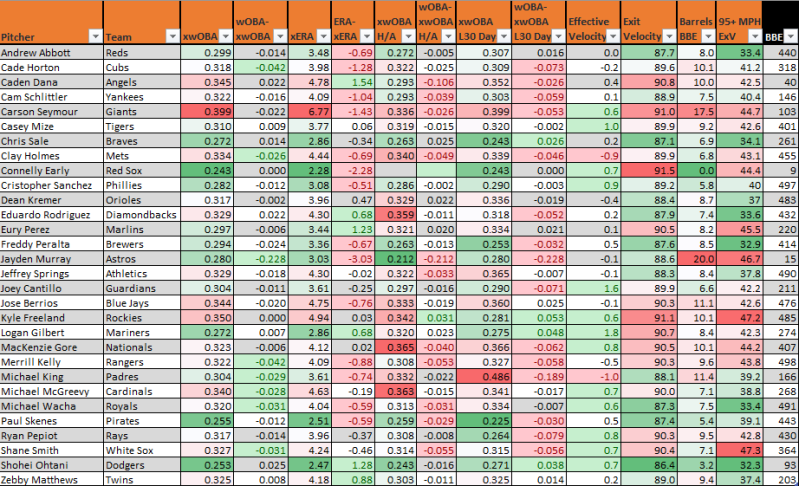 While we’re all dreaming on Zebby Matthews’ 19 K-BB% and waiting for his .358 BABIP and 70.1 LOB% to catch up with some concern about the 9.4% Barrels/BBE he’s allowed. He’s only allowed a 37.4 HardHit%, but also only collects one-third of his contact on the ground. The Angels felt like the ideal matchup, but he only struck out five of 23 batters and allowed five runs…despite not a single barrel and three hard hit batted balls (18.8%). Run bad, why don’t you? The peripherals have seen some decline (between 12.5 and 13 K-BB% each of last three starts and just 10.4% over his last five) with some velocity loss, but that velocity bounced back up to his season average against last time out. Matthews 108 Pitching+ over his last five starts matches his season score, while his 3.76 Bot ERA is only barely worse.