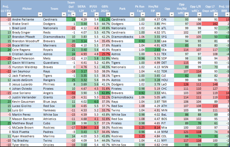 Again, I’ll point to the last chart below that shows Martin Perez having a strong run value matchup against the Orioles, but poor pitch modeling. There’s his .213 BABIP in action. He’s allowed 19.3% Barrels/BBE over his last seven starts, but just five of those 23 barrels have left the park.
