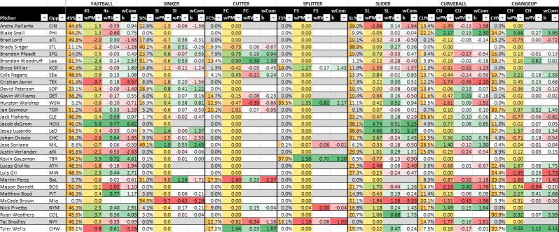 Below, these last two graphics are pitch matchup ratings, explained here. It uses pitch frequencies and run values both for the pitcher and the opposing offense and then attempts to add in pitch modeling, which sometimes differs from actual results.