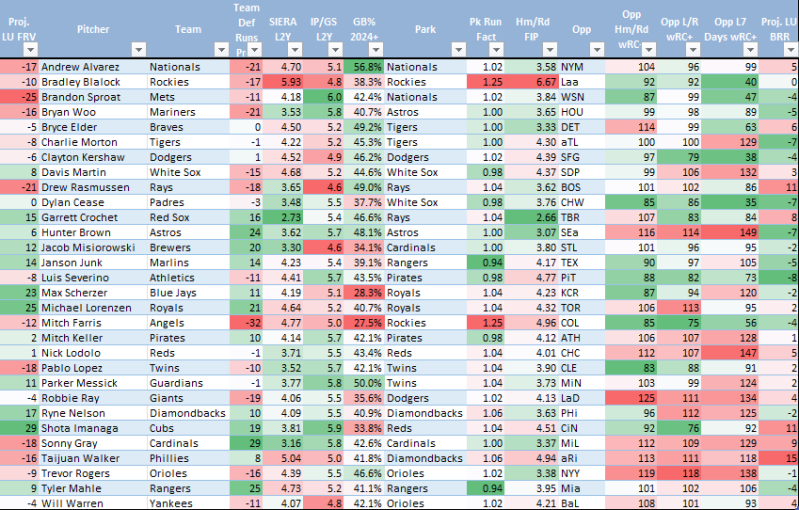 Sproat is showing a small split with LHBs about average against him through two starts and Washington can load a lineup up with them. It’s funny, five of the projected batters are above a 24.5 K% vs RHP this year, but the other four are below 16%. A thing I’ve noticed about the three rookie Met starters is that they seem to generate more called strikes than swings and misses and Sproat has been no different through two (22 CStr%, 6.3 SwStr%) and is already garnering an upper half of the board price tag.