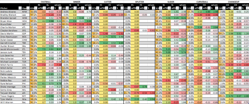 Below, these last two graphics are pitch matchup ratings, explained here. It uses pitch frequencies and run values both for the pitcher and the opposing offense and then attempts to add in pitch modeling, which sometimes differs from actual results.
