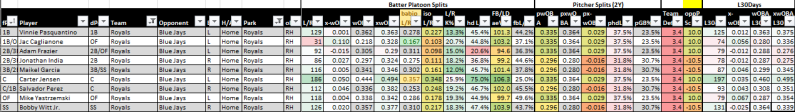 Let me show you the board I’m looking at in my spreadsheet, which includes batter splits for the season, pitcher information and L30 days for hitters.