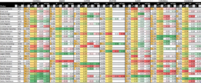 Below, these last two graphics are pitch matchup ratings, explained here. It uses pitch frequencies and run values both for the pitcher and the opposing offense and then attempts to add in pitch modeling, which sometimes differs from actual results.