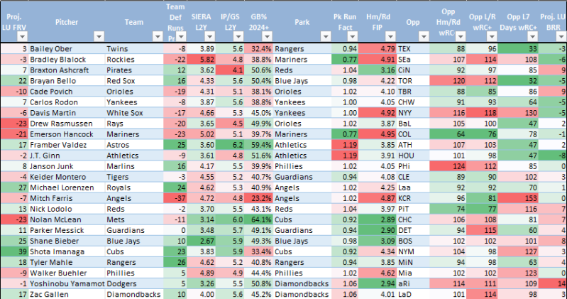 MLB.com is TBD here, but Roster Resource is listing Framber Valdez, while I can find nothing on Twitter. With just a 6.1 K-BB% and 54.3 GB% (which is pedestrian for him), Framber has allowed 41 runs (38 earned) over his last 51 innings, still allowing just 6.5% Barrels/BBE, but a 45.3 HardHit%, which has led to a .323 BABIP. While estimators are two runs better than his 6.71 ERA during this stretch, that’s still not good.