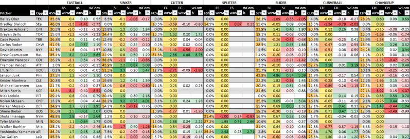 Below, these last two graphics are pitch matchup ratings, explained here. It uses pitch frequencies and run values both for the pitcher and the opposing offense and then attempts to add in pitch modeling, which sometimes differs from actual results.