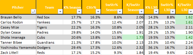Again, bats are not my thing in this game and really only Michael Busch seems like a decent value. Don’t worry, we have a pair of hittable pitchers coming up. Cease is the pitcher I have tied for my second overall ranking with Bibee. A bit more expensive and therefore a bit less valuable, but still a top three value for me on either site. The overall numbers tell me that Imanaga is a fine middle of the board pitcher here, similar to Mize, but I can’t endorse it after what I just wrote.