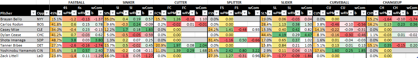Below, these last two graphics are pitch matchup ratings, explained here. It uses pitch frequencies and run values both for the pitcher and the opposing offense and then attempts to add in pitch modeling, which sometimes differs from actual results.