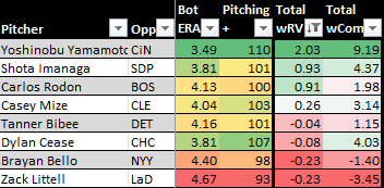 Increasing his workload and becoming the work horse for this team, while retaining a 20.8 K-BB% this season is sure to get Yamamoto some Cy Young attention, likely a top five vote getter. Add in the contact profile (52.8 GB%, 5.7% Barrels/BBE) and his 2.73 xERA is only a quarter run removed from a 2.49 ERA, though the .243 BABIP is probably not sustainable and more than 40 points below what the Dodger defense allowed. Yamamoto will likely be facing a slightly different lineup than Snell, but has held batters from either side of the plate to no higher than a .290 wOBA or xwOBA with a 40 to 50 point reverse split.