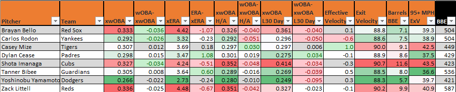 Brayan Bello allowed 17 runs (15 earned) over his last 25 innings with just a 3.6 K-BB% and no more than four strikeouts in any of those five starts. The contact profile was fine (7.1% Barrels/BBE, 39.3 HardHit%), but Bello set a new career low with just a 9.2 K-BB%, keeping all of his estimators above four and all of his non-FIP estimators more than a run above a 3.35 ERA (nine of 71 runs unearned).